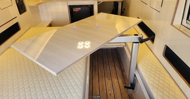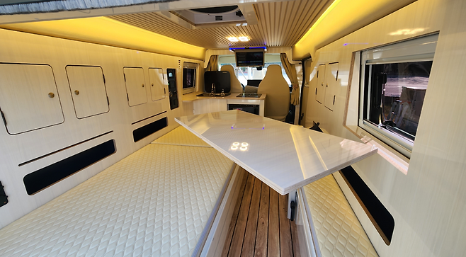 주방기구는 Haatz 매립형인덕션과 SK매직 20리터 전자렌지, 그리고 비클시네마의 안드로이드전동TV, 인켈 블루투스오디오까지 갖췄다. 특히 인버터를 설치, 외부 전원을 손쉽게 연결할 수 있어 어디서든 편리하게 사용할 수 있다.