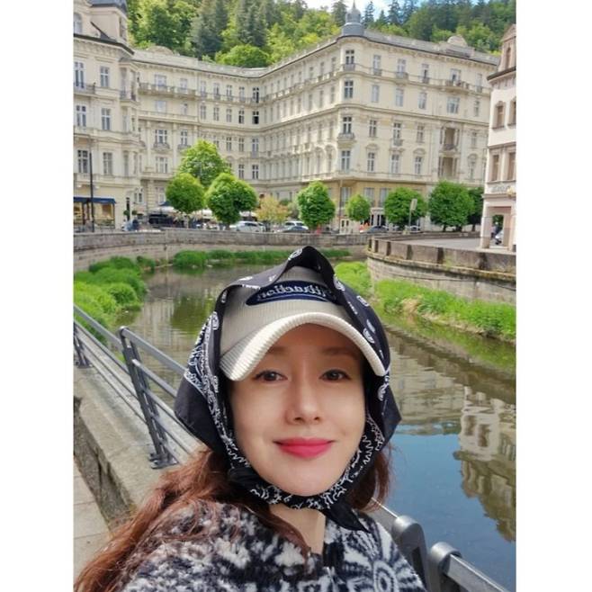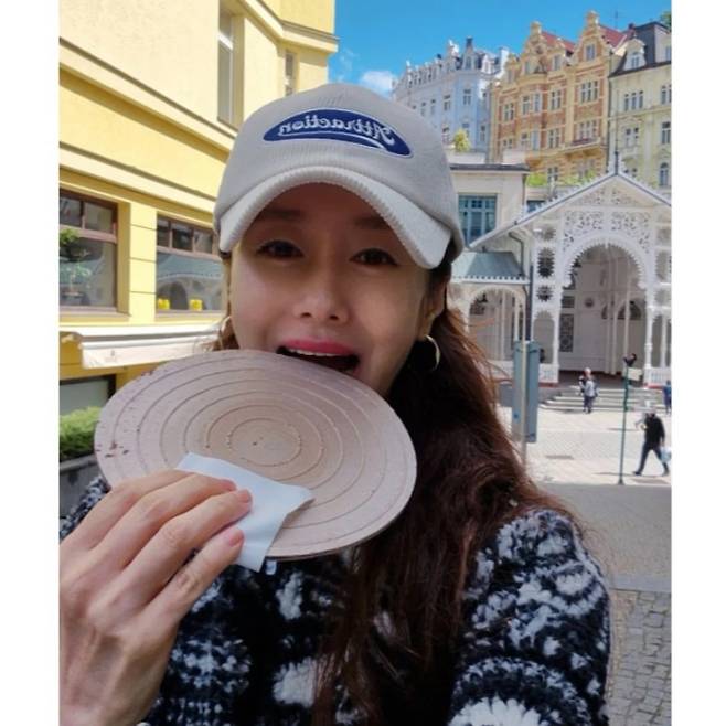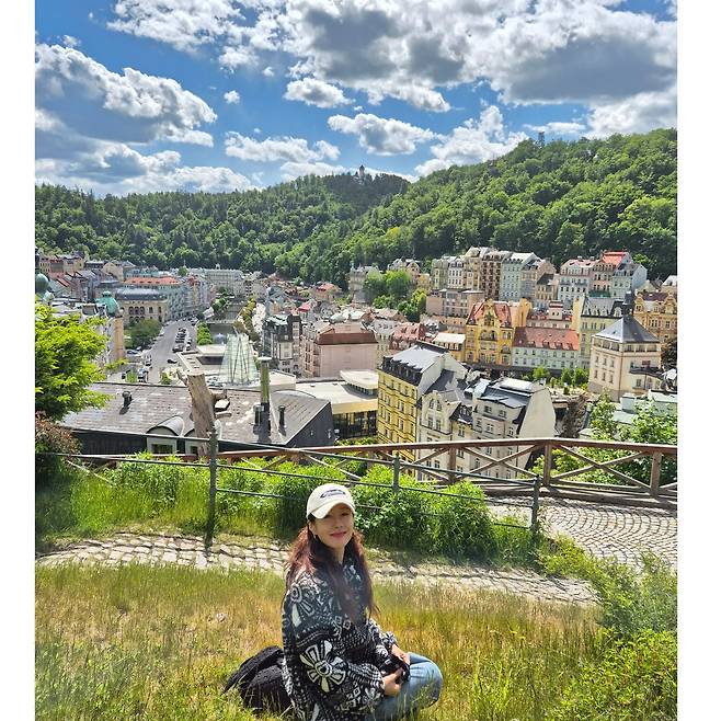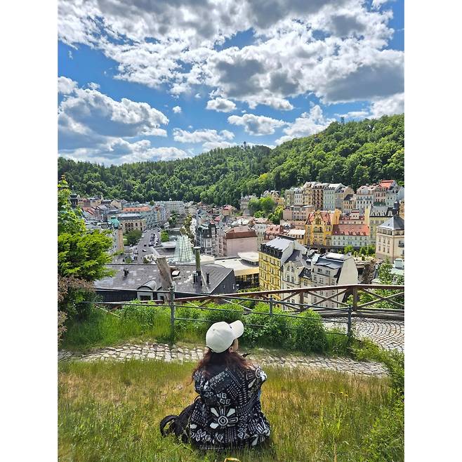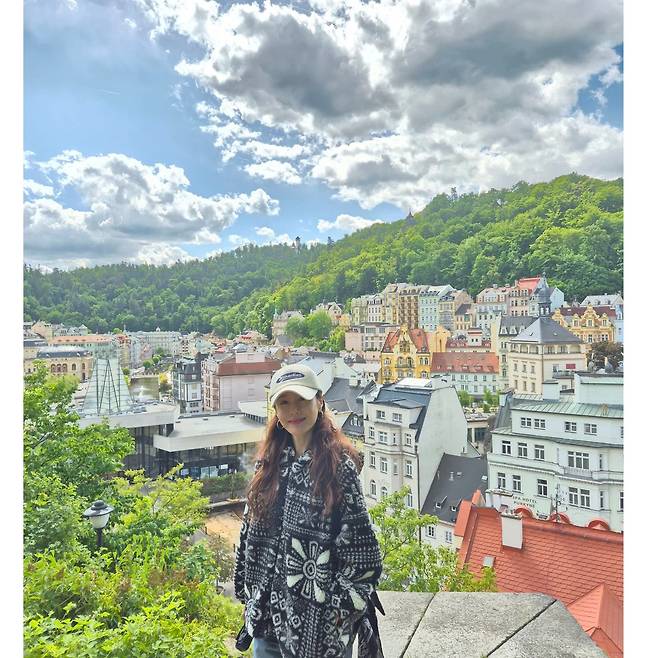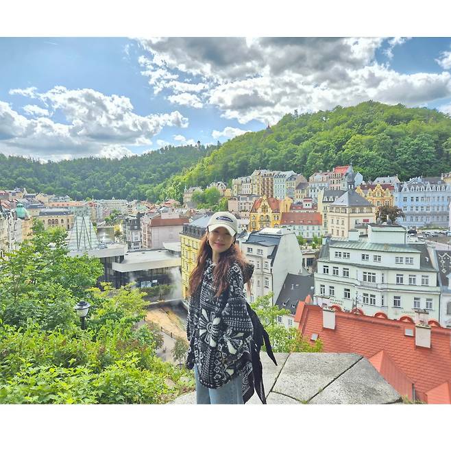 체코의 작은 도시, 카를로비 바리의 맑은 하늘 아래 김지수의 스타일이 고요하게 녹아들었어요.
