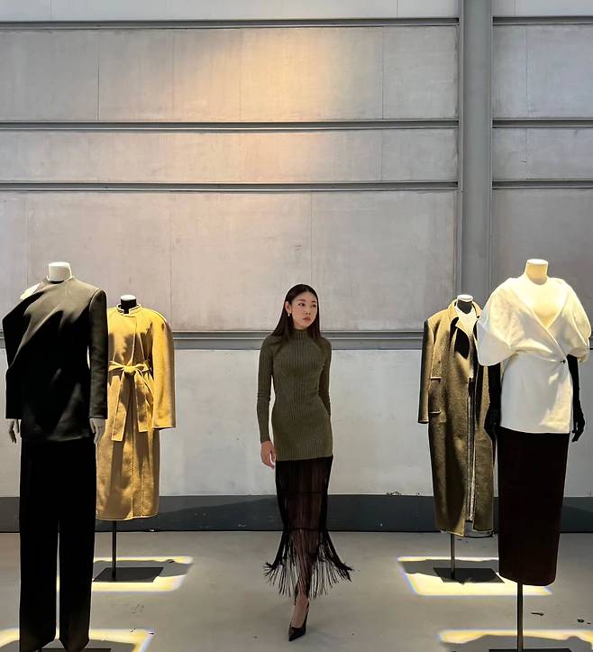카키색 니트 원피스와 프린지 디테일이 돋보이는 블랙 스커트를 조합해 세련된 미니멀리즘을 선보였다. 몸에 꼭 맞는 실루엣과 독특한 텍스처가 조화를 이루며, 전시 공간의 모던한 분위기와 자연스럽게 어우러진다.