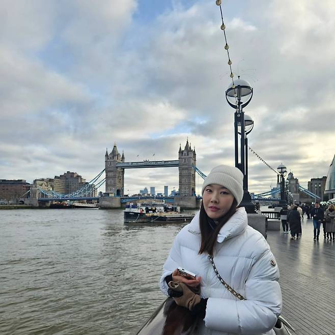 세 번째 사진에서는 런던 타워 브리지를 배경으로 화이트 패딩 점퍼를 착용해 따뜻하면서도 트렌디한 겨울 스트릿 룩을 연출했다. 여기에 베이지색 장갑과 니트 모자를 더해 색감의 조화를 이루며, 편안함과 우아함을 동시에 담아냈다.