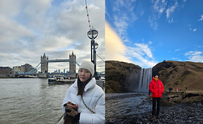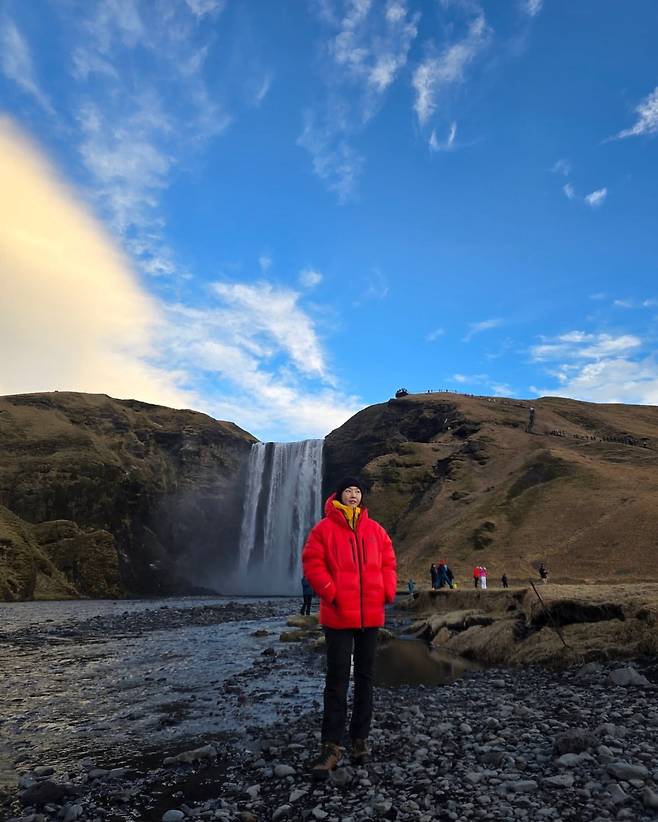 한혜진은 아이슬란드 스코가포스 폭포를 배경으로 강렬한 레드 컬러의 패딩 점퍼를 착용했다. 밝은 색상의 외투는 자연의 어두운 톤과 대조를 이루며 시선을 사로잡는다. 여기에 블랙 팬츠와 트레킹 부츠를 매치해 실용적이면서도 스타일리시한 아웃도어 룩을 완성했다.