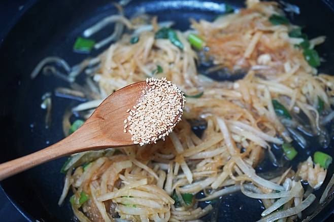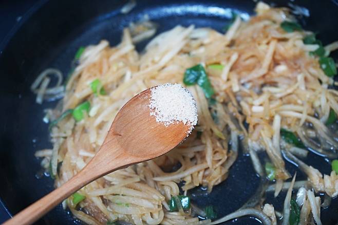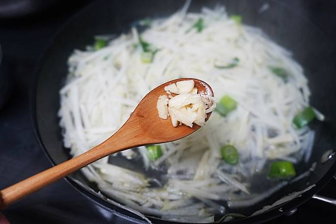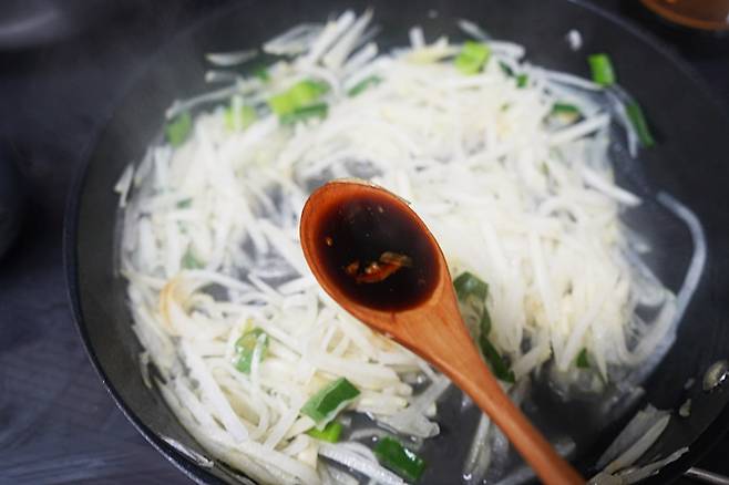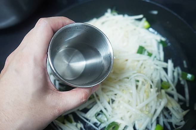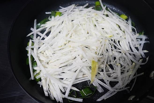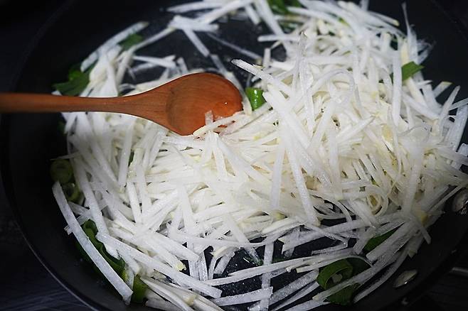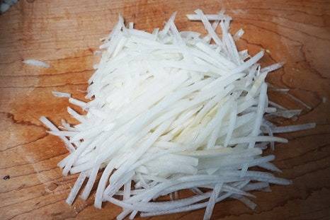 너무 얇게 썰면 무의 식감이 느껴지지 않으니까 적당히 두껍지 않게 채를 썰어 주세요