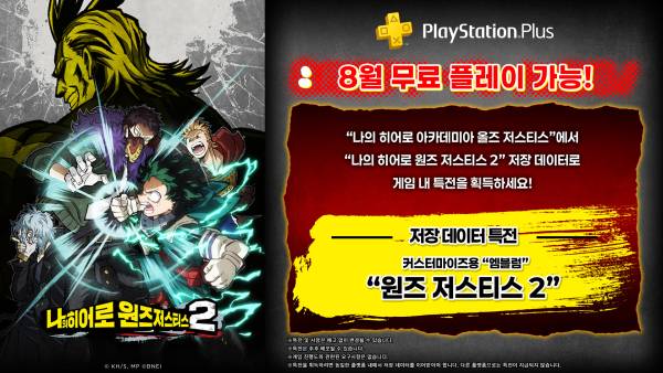5일부터 PS플러스 멤버십 가입자라면 오는 9월 1일까지 기간 한정으로 ‘나의 히어로 아카데미아 원즈 저스티즈 2’를 무료로 플레이 할 수 있다. 이 게임은 원작 애니메이션인 '나의 히어로 아카데미아' 속 스테이지를 종횡무진 누비며, 등장 캐릭터의 개성(초능력)을 구사해 초인적인 힘을 사용한 박력 넘치는 배틀을 다룬다.