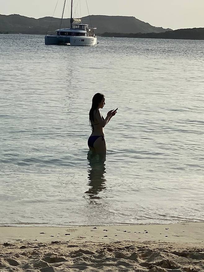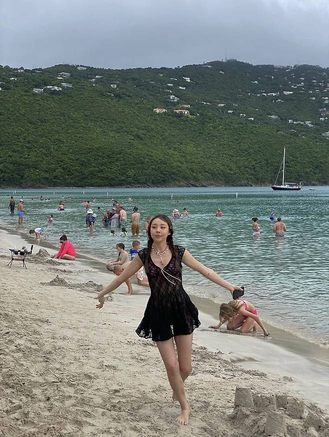 첫 번째는 블랙 시스루 원피스에 비키니를 매치한 해변룩으로, 섹시하면서도 자연스러운 무드를 연출했습니다.