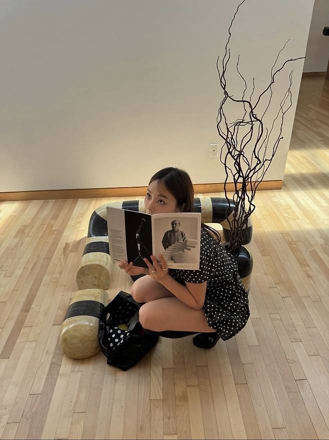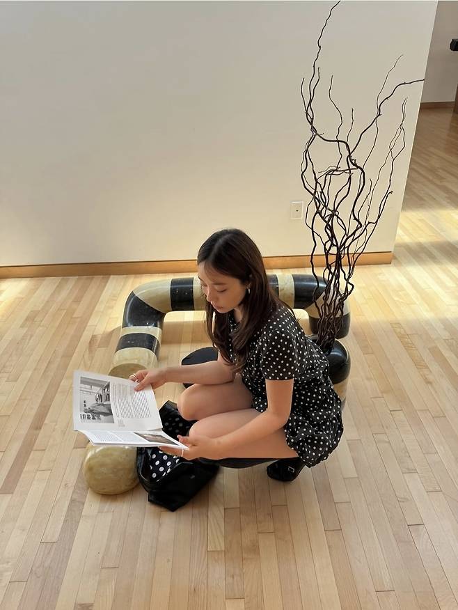 미니멀한 액세서리와 차분한 헤어스타일로 전체적인 조화를 이뤘으며, 공간과 어우러지는 정제된 스타일이 돋보였습니다.