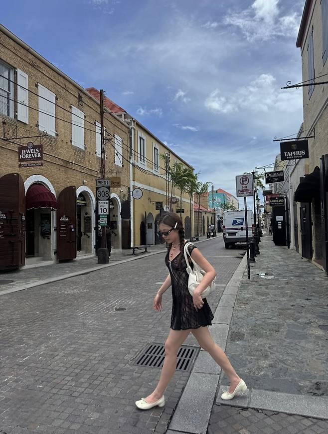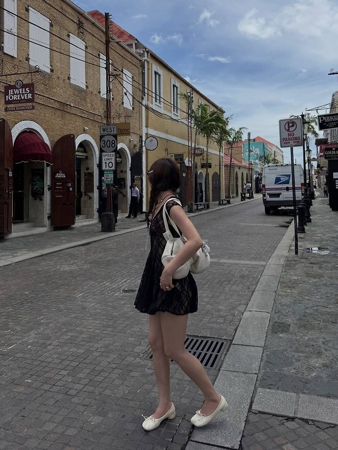 화이트 플랫 슈즈와 아이보리 백, 진주 액세서리, 양 갈래 머리로 걸리시한 포인트를 더해 여행지에서의 캐주얼한 세련미를 강조했습니다.