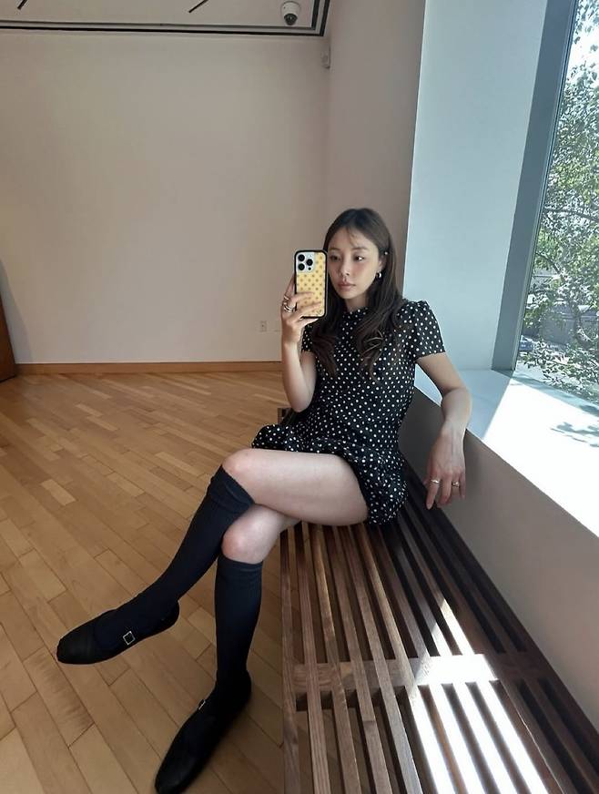 두 번째는 도트 점프슈트에 니삭스와 메리제인 슈즈를 매치한 실내룩으로, 클래식하면서도 소녀스러운 분위기를 표현했습니다