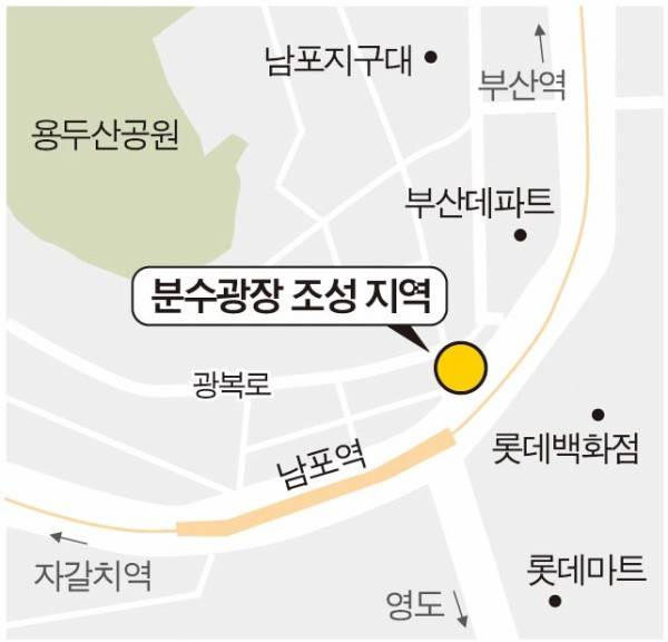 부산 중구 광복로 입구에 분수광장이 조성된다. 예산을 확보한 중구는 분수광장이 관광객을 유입과 침체한 상권 회복을 견인할 것으로 기대하고 있다.
