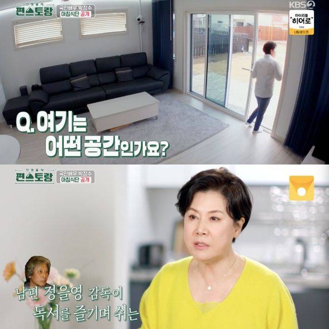 본격적으로 박정수의 일상이 공개됐다. 그는 정원이 있는 깔끔한 주택에서 시청자들에게 인사를 건네며 “72년도에 MBC 5기로 입사했다. 동기로 이계인, 고두심이 있다”라고 밝혔다. 이어 그는 커피를 마시며 집 앞 정원을 바라보면서 여유로운 아침을 보냈다. 알고보니 이 집은 남편 정을용 감독이 전원생활을 하려고 지은 집이었다고. 박정수는 “가끔 가다가 그 양반만 혼자 와서 쉬는 공간이라고 보시면 될 것 같다”라고 설명했다.