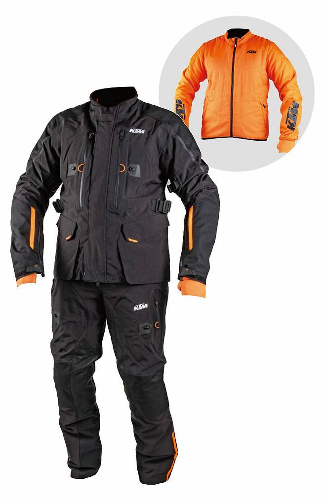 편안한 착용감과 고급스러운 소재감이 돋보이는 KTM 투어링 세트. 외부에는 방풍과 방수, 내마모성, 내인열성, 탄성이 좋은 고성능 멤브레인 ‘심파텍스’ 소재를 사용했다. 안감은 전체 메시 소재를 적용해 쾌적한 착용감을 유지해 준다. 탈착이 가능한 써모 재킷은 단독으로도 착용이 가능하다. 어깨와 팔꿈치보호대가 기본으로 적용되었다. 허리 스트랩으로 자신에게 맞는 피팅을 조절할 수 있다. 바지도 전체적인 소재와 구성이 같고, 무릎과 엉덩이에 보호대를 기본으로 적용했다. 또한 재킷과 연결할 수 있는 지퍼를 적용해 착용감을 높일 수 있다.