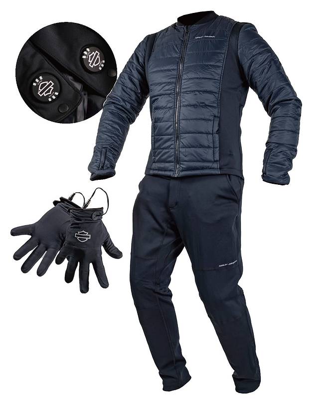 카본 나노 파이버 가열 시스템을 적용한 할리데이비슨 열선 시리즈. 재킷은 가슴 2개, 후면 1개, 양팔 상단까지 총 5개의 패널을 적용해 빠르고 균일한 보온성을 자랑한다. 또한 폴리에스테르 스판덱스와 트리코트 소재를 사용해 높은 내구성과 편안한 착용감을 준다. 접이식으로 적용된 리모컨을 통해서 재킷, 바지, 장갑 모두 개별로 3단계 온도 조절이 가능하다. 바지는 각 다리와 허리 총 3개의 패널을 지원한다. 장갑은 재킷과 연결해서 리모컨을 하나로 사용한다.