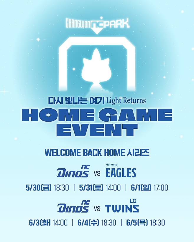 NC는 28일 보도자료를 내고 “두 달여간 홈 경기가 열리지 못했던 공백을 마치고 야구팬들과 다시 마주하는 의미있는 자리로 ‘다시 빛나는 여기, Light Returns’를 슬로건으로 내세웠다”며 “NC는 이를 통해 창원NC파크와 지역 상권에 활력을 불어넣고 야구팬들과 재회를 기념하는 다채로운 프로그램을 선보일 예정”이라고 전했다.