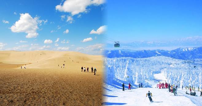 돗토리현은 센다이강 모래 위에 쌓인 다이센산의 화산재가 풍화작용을 일으켜 거대한 사구를 형성하고 있는 '돗토리 사구'가 가장 유명한 관광지인데요. 낙타와 마차를 타고 모래언덕을 둘러보는 것이 가능함을 물론 패러글라이딩, 샌드보드, 윈드서핑 등 다양하게 돗토리 사구에서 시간을 보낼 수 있습니다.
