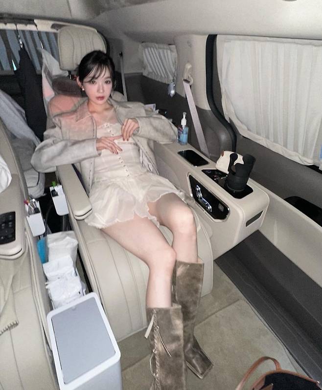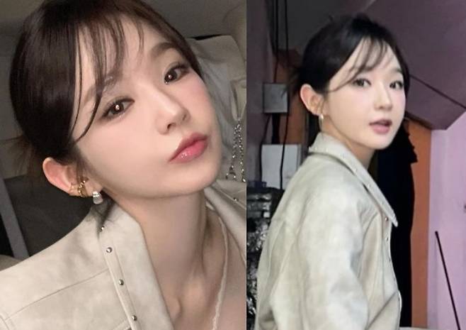 사진 속 강민경은 깃털번, 까치번 스타일링으로 청순하면서도 약간 시크한 분위기를 자아내고 있습니다.