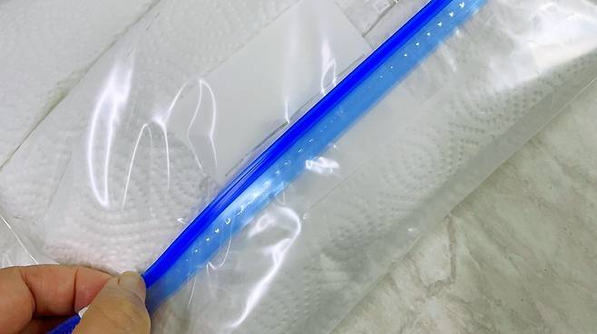이제 지퍼백에 보관해 주시는데요. 이때 지퍼백의 공기를 최대한 빼서 보관해 주시는 게 좋습니다!
