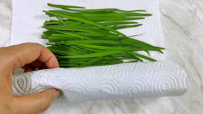 이제 키친타월에 부추를 올려주고 김밥 말아주듯이 돌돌 말아주세요. 부추는 최대한 넓게 펴서 얇게 깔아준 뒤 말아주세요! 양이 많다면 한 번에 다하지 말고 양을 나눠서 해 주세요