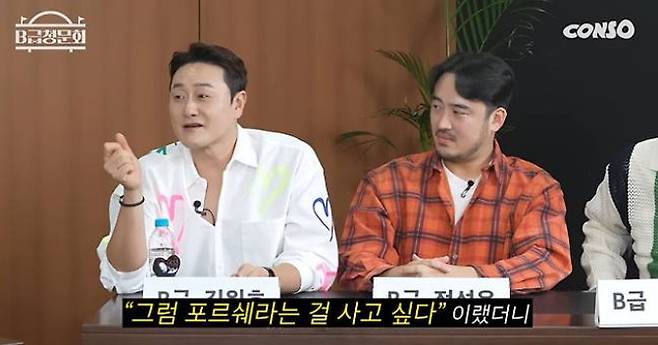 그러자 정성윤은 "포르쉐 타실때 봤다"고 폭로했고, 김원효는 "그래서 내가 얘기를 하려고 하잖아. 와이프가 자기 외제차 탔으면 좋겠다 이런거다. 그래서 진짜 진짜 생각하다가 그럼 포르쉐라는걸 사고싶다 했더니 얼마냐 이러니까 그게 1억이 넘지 않나. 자기가 그동안 모아놨던걸 한방에 나한테 수표로 주더라. 혹시나 여러분도 뭘 받고싶다 이러면 자잘하게 뭐 버버리 롤렉스 얘기하지 말고 한방에 포그쉐라고 해라"고 조언해 웃음을 안겼다.