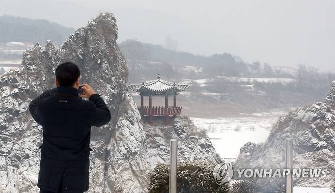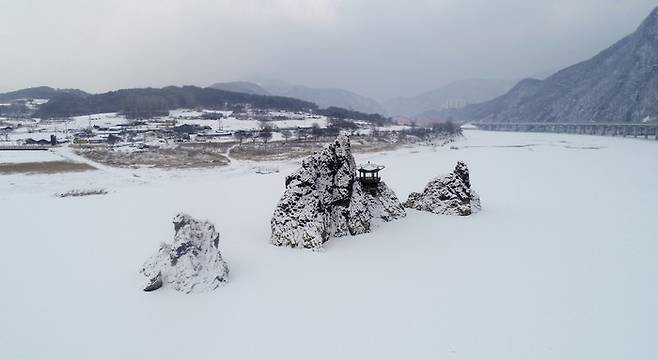 장군봉 허리에 자리 잡은 작은 정자, 삼도정에 하얀 눈이 소복이 쌓이면 겨울 도담삼봉의 미학은 비로소 완성됩니다.