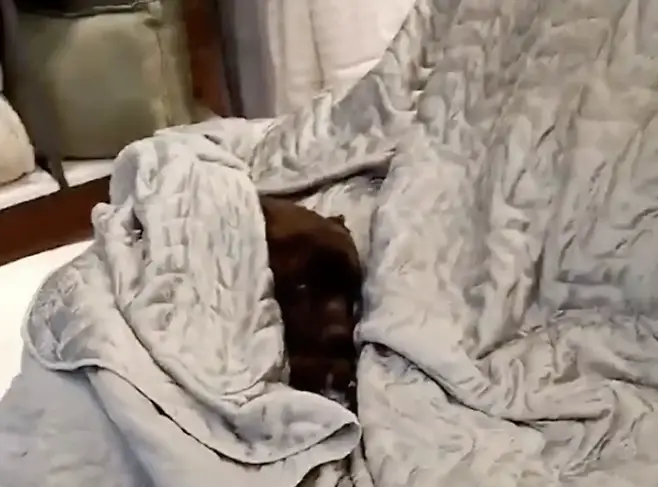 과연, 무작위로 길 잃은 개가 모랄레스의 가게 안으로 들어와 전시용 침대로 들어온 모양입니다.