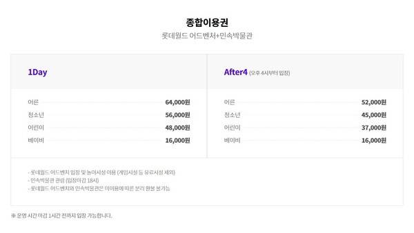 위 파크이용권은 롯드월드 어드벤처 전체를 이용할 수 있는 자유이용권 기본 요금입니다. 여기에서 성인 3천원, 청소년 2천원, 어린이 천원만 추가하면 '민속박물관'을 동시에 이용할 수 있으니 참고해 주세요.