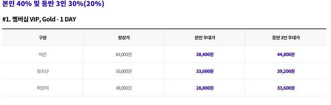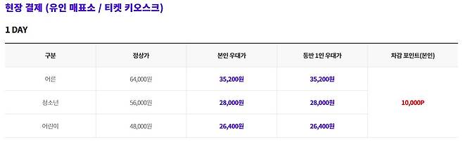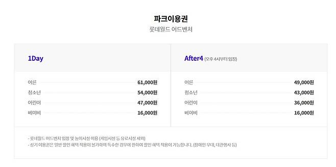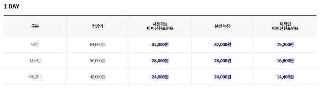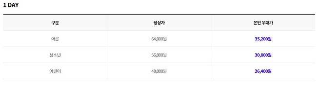 성인 : 61,000원 / 청소년 : 54,000원 / 어린이 : 47,000원 / 베이비 : 16,000원