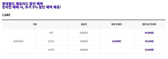 할인율은 1DAY 대인 기준으로, 자세한 내용은 롯데월드 공식 홈페이지를 통해 자세히 확인해 보는 것을 권장해 드립니다.
