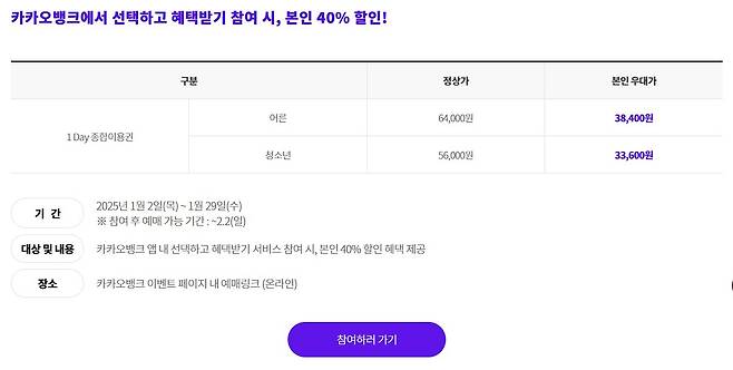 두 번째로는 카카오뱅크 앱의 '혜택받기'를 활용하는 것인데요. 카카오뱅크 앱을 사용하시는 분들은 간단한 방법을 통해 무려 40%나 되는 롯데월드 티켓 할인 혜택을 받으실 수 있어요. 다만, 가족이나 친구 등 동반자 혜택은 없고 본인만 가능하기 때문에 참고해 주세요.