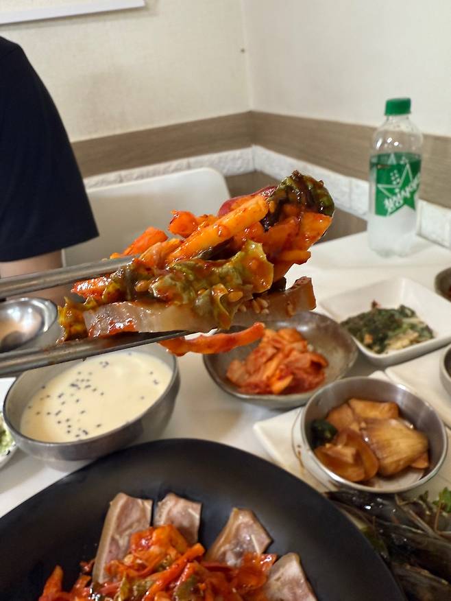 또한 상차림에 함께 나온 편백 찜기에는초장에 살짝 버무린 신선한 야채 무침이 담겨 있었다.양배추, 오이, 당근 같은 채소들이 아삭한 식감과 상큼한 맛을 살려내다소 묵직할 수 있는 해물 반찬 사이사이에 상쾌한 리듬을 만들어주었다.