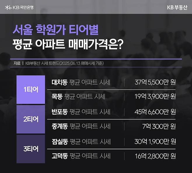 이러한 서울 학원가 계급도는 단순한 교육 정보의 나열을 넘어 지역 부동산 가치와 시장 흐름을 읽는 하나의 기준이 되고 있습니다. 실제 학군 프리미엄이 높은 지역일수록 지역 내 집값도 높게 형성되고 있는데요. KB부동산 시세 트렌드(6월 13일 시세 기준)에 따르면, 학군 1티어 지역인 강남구 대치동 아파트의 평균 시세는 37억 5500만원으로 강남구 내에서 압구정동(67억원)에 이어 2번째로 높습니다. 목동 아파트 평균 시세도 19억3900만원 수준으로 양천구 내에서 제일 높은 시세를 형성하고 있고요.