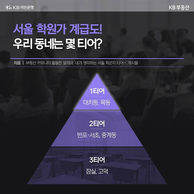 이런 배경 속에서 서울 각 지역의 학원가에도 자연스럽게 서열이 형성되고 있습니다. 학원 밀집도, 입시 특화 여부, 학부모 커뮤니티의 정보력 등이 종합적으로 반영된 이른바 ‘학원가 계급도’가 만들어진 것인데요. 이런 측면에서 최근 국내 최대 부동산 커뮤니티에 올라온 ‘내가 생각하는 서울 학군지 티어~’(글쓴이: 똘똘한 열채)라는 글이 많은 이들의 주목을 받고 있습니다.