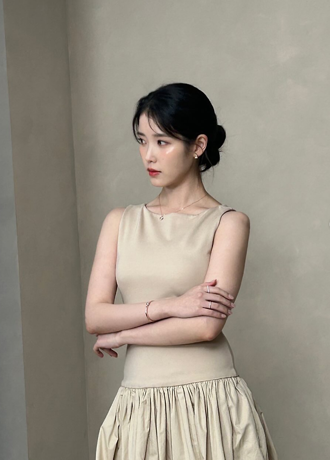 또 다른 사진에서는 동일한 베이지 색상의 슬리브리스 드레스를 입고, 목선이 드러나는 로우번 헤어스타일로 클래식하면서 여성스러운 매력을 발산했다. 비교적 심플한 착장에 다채로운 주얼리로 포인트를 준 아이유는 부드럽고 선한 외모와 조화롭게 매치된 스타일링으로 눈길을 끌었다.