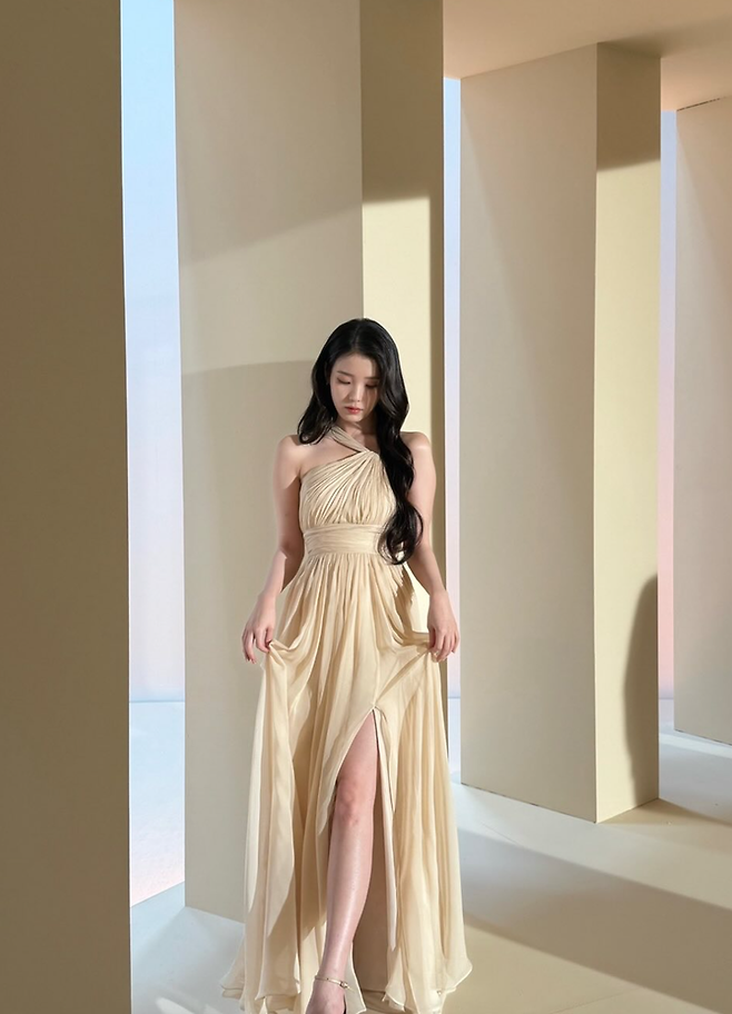 공개된 사진 속 아이유는 청순하고 단아한 자태로 다양한 스타일링을 선보이며 팬들의 마음을 사로잡았다. 로맨틱한 베이지 톤의 롱드레스를 착용한 그는 다리라인이 드러나는 쉬폰 디테일과 어깨를 드러낸 홀터넥 디자인으로 우아하면서 매혹적인 분위기를 자아냈다.