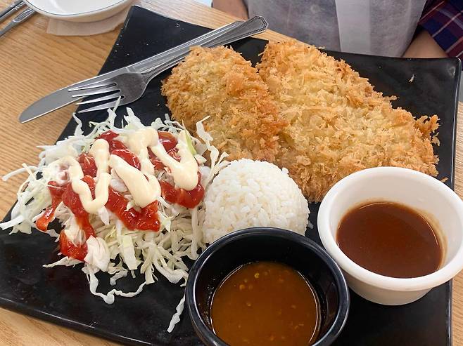 어쨌든 음식 김치볶음밥, 서울 돈까스2개, 쫄라. 총 네가지를 주문했고 네명이서 맛있게 막고왔습니다. 셀프바에 김치 단무지 앞치마 있고 오뎅국물도 있습니다. 김치볶음밥과 돈까스는 가족들이 모두 극찬했어요.