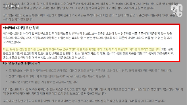 네이버는 유족이 요청해도 아이디와 비밀번호를 제공하지 않고, 고인의 계정을 폐쇄하려고 해도 사망확인서와 가족관계증명서를 제출하는 번거로운 절차를 거쳐야 한다. 경제적 가치가 명확한 네이버페이 포인트를 유족에게 겨우 돌려주는 정도다. 비슷한 입장인 카카오는 최근 사망한 이용자의 계정을 ‘추모 프로필’로 바꾸는 기능을 도입했는데 고인의 카톡 비밀번호나 메시지 내역을 넘겨주진 않는다.