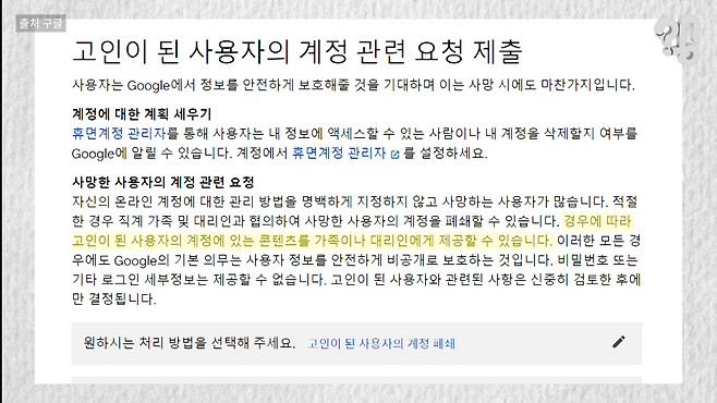 심지어 구글은 상속인을 미리 못 정했어도 고인의 콘텐츠에 제한적으로 접근을 허용하기도 하는데 어떤 유튜브를 보고 누구한테 메일을 보냈는지 모두 오픈되는 건 아닌가 좀 찜찜하긴 하다.