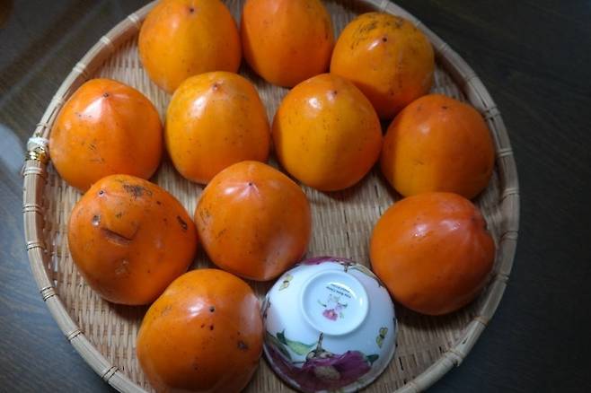 대봉감의 크기가 얼마나 큰지 밥공기와 비교해 보았습니다. 밥공기를 엎어 놓은 것보다 훨씬 큰 크기를 자랑하는 대봉감! 하나만 먹어도 배가 부를 정도로 든든합니다.