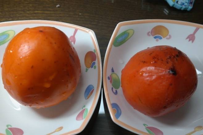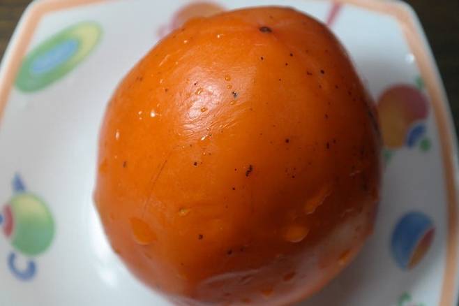 잘 익은 대봉감 홍시는 껍질을 벗겨 수저로 떠먹는 것이 가장 간편하고 맛있습니다. 특히 차가운 홍시를 먹으면 더욱 꿀맛입니다. 저는 두 내외가 한 개씩 먹으려고 깨끗하게 씻어서 접시에 담아 놓았습니다. 보기만 해도 군침이 도네요!