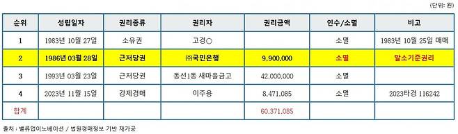 • 말소기준권리: 소유권 이전 후 최초로 설정된 권리는 1986년 3월 28일 자 ㈜국민은행의 근저당권(채권최고액 990만 원)입니다. 이 근저당권이 '말소기준권리'가 되며, 경매 시 이보다 후순위인 모든 권리는 소멸합니다.