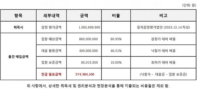 o 대출 활용 금액: 400,000,000원 (낙찰가 대비 약 46.51%)