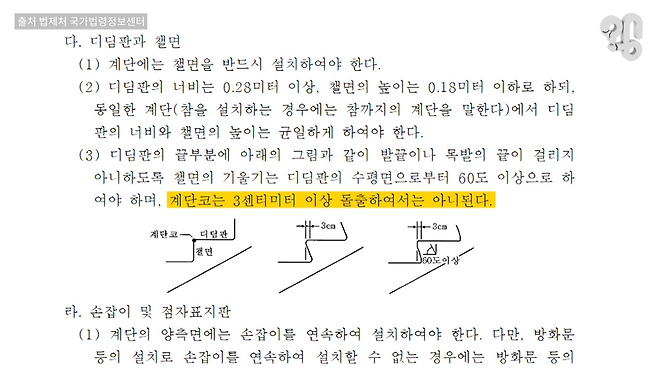 바로 이 계단코가 우리가 급하게 올라갈 때 정강이를 아작내는 주범, 그런데 이 계단코를 설치해도 된다고 심지어 법에 규정까지 돼 있다는 건 대부분 모르는 사실이다.