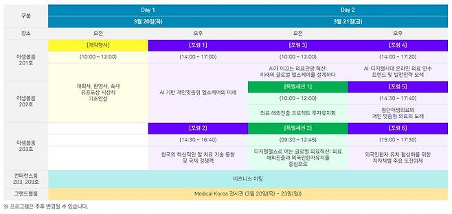 내일(20일) 개막식을 시작으로 ▲AI 기반 개인 맞춤형 헬스케어를 주제로 하는 학술대회 ▲해외와 국내 기업 간의 비즈니스 미팅 ▲한국 의료의 우수성을 알리는 전시홍보관 등의 프로그램이 예정돼 있다. 아울러, 보건의료 분야 주요 협력국들과의 고위급 양자회담(G2G)도 개최될 예정이다.