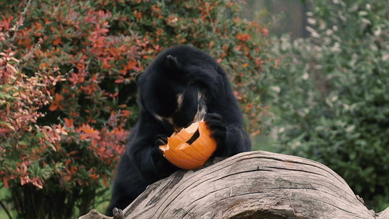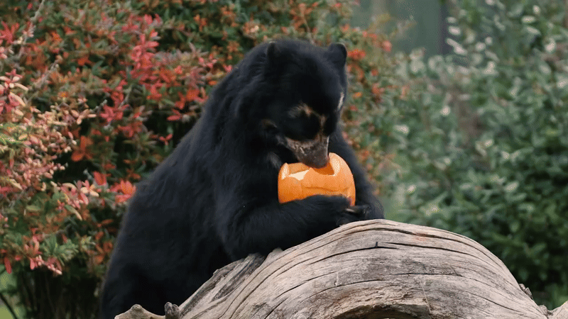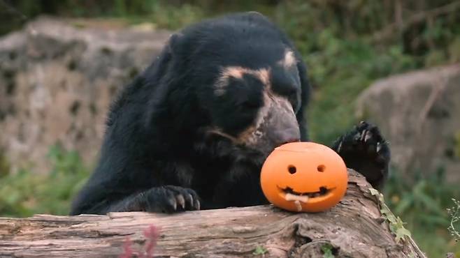 영국 체스터 동물원에 사는 안데스 곰인 버니는할로윈을 맞아꿀로 코팅된 호박을 선물로 받아 특별한 간식을 즐겼습니다.