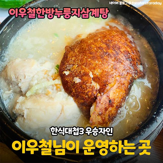 이우철한방누룽지삼계탕은 한식대첩3 우승자인 국가공인 조리기능장이신 이우철님이 운영하시고 계시다고 해요. 닭은 비린내가 나는 순간 먹기 싫어지는데 이곳은 12시간 저온숙성과 염지 조리법을 이용하여 비린내와 냄새를 완벽히 잡았다고 합니다!