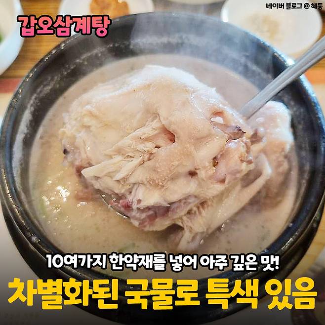 갑오삼계탕은 다른 곳과는 차별화된 국물로 특색 있는 삼계탕 맛을 띈다고 해요. 몸에 이로운 10여 가지 한약재를 넣어 10시간 이상 푹 고아 만든 육수만을 사용하여 맑은 국물과는 비교할 수 없는 깊은 맛을 띈다고 해요.