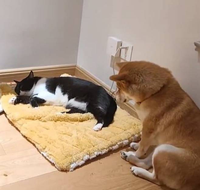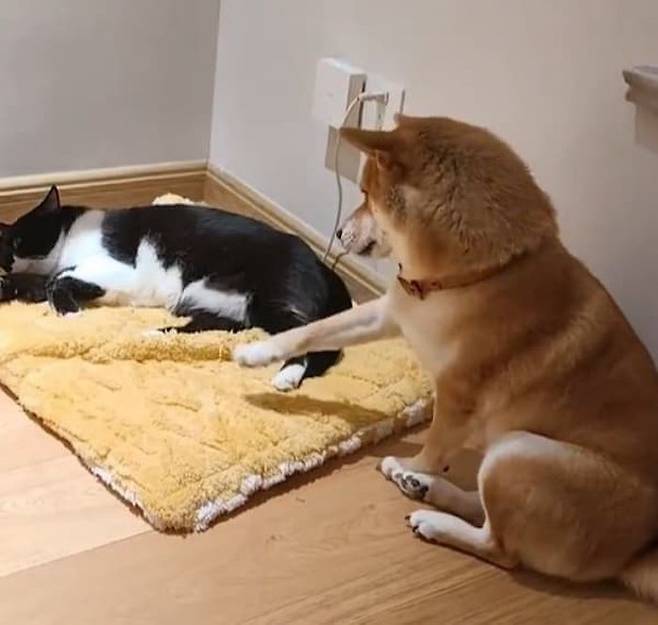 사연은 이렇습니다. 이날 무슨 영문인지 고양이가 시바견 강아지의 침대에 올라가 자리를 차지하더니 자기 침대라도 되는 것 마냥 누워 있었죠.