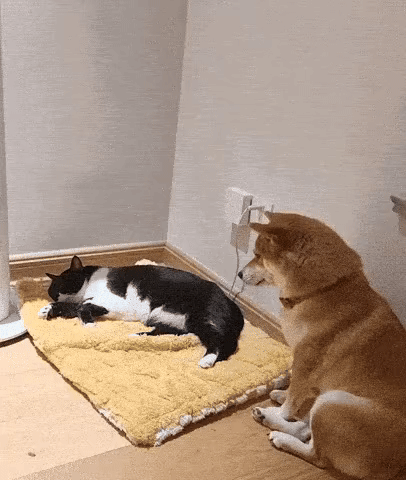 분명히 자기 침대임에도 불구하고 고양이 앞에서는 신기할 정도로 한없이 작고 또 작아지는 시바견 강아지. 이 조합 정말 너무 귀여운 것 아닙니까.