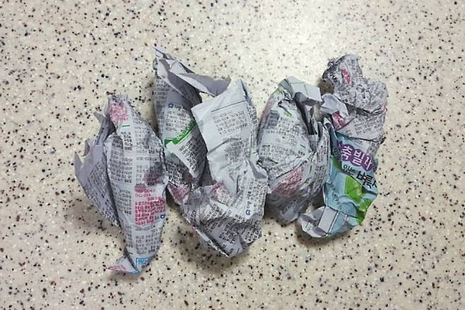 그다음 신문지로 고구마를 각각 감싸주세요. 만약 신문지 없다면 종이포일로 감싸주셔도 됩니다.