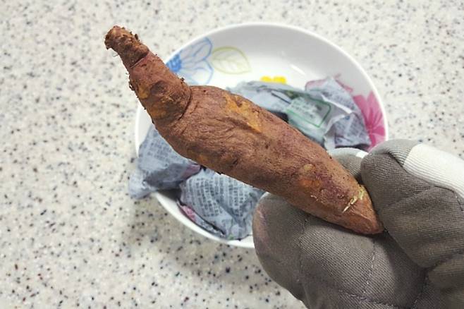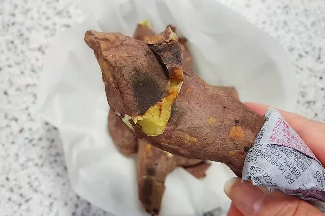 껍질을 벗기는데 정말 군고구마 느낌 제대로 나죠? 처음에 벗길 때는 너무 뜨거우니 조심하세요.