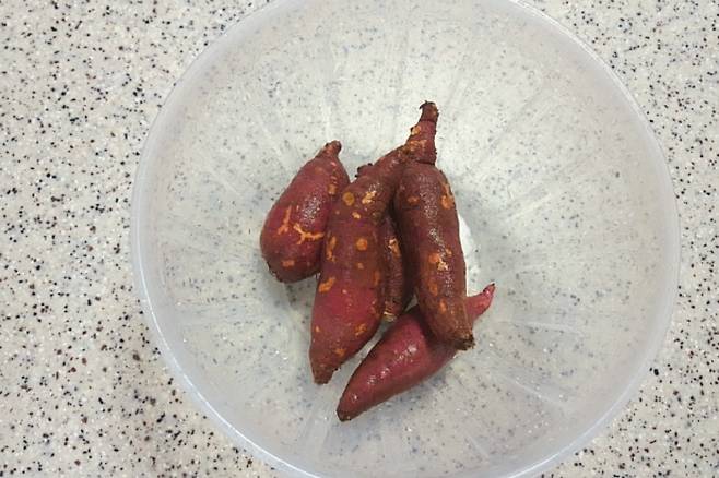 5분 뒤 꺼내보니 고구마가 살짝 익은 상태예요. 고구마가 너무 크다면 몇 분 더 추가해 주시되 다 익으면 안 되고 살짝 익은 상태로 만들어 주세요.