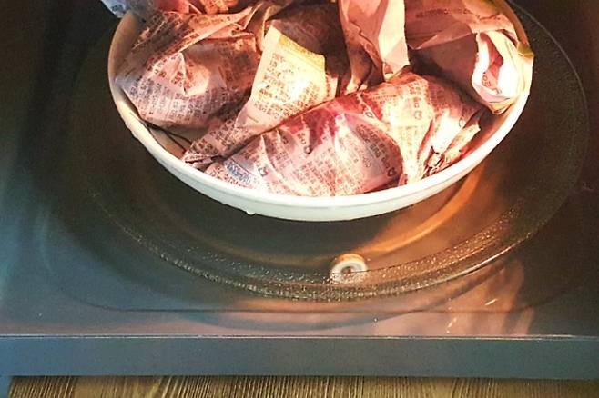 이제 신문지로 싼 고구마를 전자레인지에 5분 돌려서 1차로 쪄 줄 건데요. 바로 돌리면 안 되고 전자레인지 가능한 용기에 담아 신문지 겉면에 물을 뿌려 수분을 충전해줍니다. 이렇게 해주면 전자레인지에 익혀도 수분이 증발하지 않아 고구마를 촉촉하게 만들 수 있습니다.